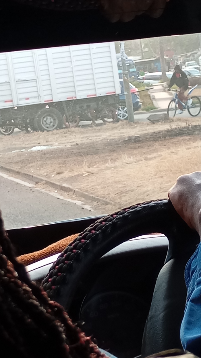 The image, captured from the interior of a vehicle, displays an outdoor street scene under daylight conditions. In the immediate foreground, a person's right hand, wearing a blue sleeve, grips a steering wheel adorned with a black and red braided cover. To the left, part of a person's dark, braided hair is visible. A speedometer, partially obscured, indicates numerical markings including '60', '80', and '100' km/h. Outside the vehicle, a paved road or shoulder with a faded white edge line transitions to a raised concrete curb. Beyond the curb, a dry, unkempt verge extends, characterized by light-brown soil and sparse, dehydrated vegetation. In the mid-ground, a large white box truck with horizontal ribbed sides and multiple rear wheels is visible on the left, positioned near or partially on the verge. To the right of the truck, a person rides a blue and white bicycle with a prominent elevated rear seat structure. The cyclist is dressed in a dark jacket and a dark head covering, appearing to ride on a paved surface adjacent to the dry verge. The background reveals an urban or semi-urban setting with additional parked or stationary vehicles, including a dark blue sedan and a red car. Distant, indistinct structures or buildings are also present. A vertical utility pole stands in the mid-ground, slightly intersecting the view between the truck and the cyclist. The overall environment suggests dry and dusty conditions. The image does not contain specific landmarks, street signs, or unique architectural details sufficient to forensically identify the precise location as the City of London ward, Kenya. However, the visual characteristics are consistent with urban or peri-urban environments found within Kenya.