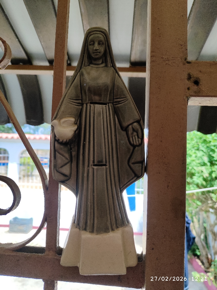 A vertical image captured on February 27, 2026, at 12:21 PM, depicts a religious figurine positioned within a reddish-brown metal grille, likely a window or door security barrier, in Tinaquillo, Venezuela