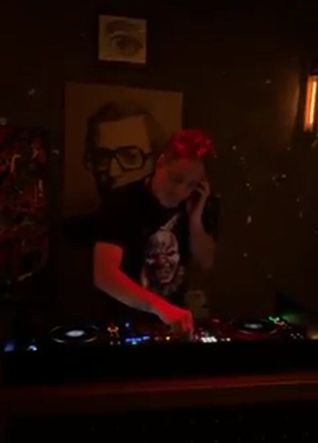 A fair-skinned DJ with pink-red hair is DJing at a club. They wear a t-shirt with a scary clown face graphic, and dark pants. They’re standing behind a DJ mixing board with two turntables and a mixing section in the middle. The DJ is wearing headphones on one ear, and they are tapping at the controls of the DJ board. Behind the DJ is a dark wall with a large portrait of a man with glasses, and above this painting is another art piece depicting an eye. To the left and right of the painting are more abstract art pieces and a small vertical orange wall light. The club is dark, and lit with red accent lighting.