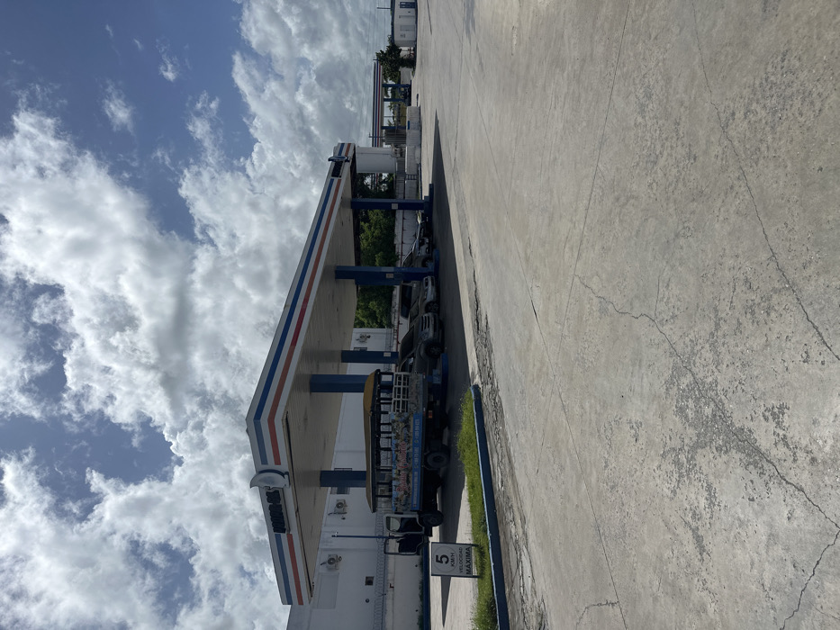 The image depicts a Natura Gas station located in Higüey, Dominican Republic, under a partly cloudy sky. The scene is illuminated by daylight. In the foreground, a large, light gray concrete pavement extends, showing surface wear and crack patterns. To the left, a small patch of green grass surrounds a white sign displaying "5 KM/H VELOCIDAD MÁXIMA" (5 KM/H MAXIMUM SPEED) in black text. The central feature is a white gas station canopy with prominent blue and red horizontal stripes along its edges, supported by several blue pillars. The "NATURA GAS" logo, incorporating a moon and star motif, is visible on the front fascia of the canopy. Under this main canopy, a light blue truck with a modified, open-sided passenger compartment, featuring a yellow roof canopy, is parked. The truck's sides display colorful advertisements and text, including contact phone numbers. To the right of this truck, a line of several dark-colored vehicles, consistent with SUVs or vans, are also parked under the canopy. Behind the main canopy and to the left, a white building with visible air conditioning units is present. A security fence topped with barbed wire runs along the perimeter of this building. In the middle ground, green foliage is visible. Further in the background, another, smaller gas station canopy with a similar blue and red stripe design is discernible, along with additional white utility structures. No individuals are visible in the scene.