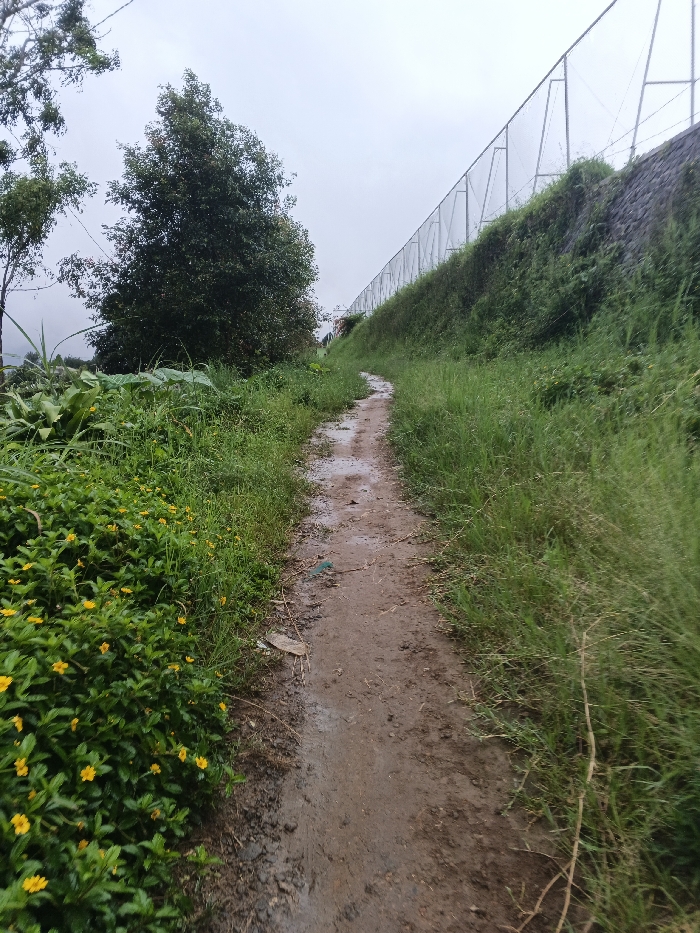 The image depicts a narrow, wet, muddy dirt path curving slightly to the left and receding into the distance under an overcast sky. On the left side of the path, dense green foliage is present, including a ground cover with numerous small yellow flowers in the foreground, larger broad-leafed plants, and a mature tree with dark green leaves further back. On the right side, a steep embankment covered in tall green grass rises from the path. Along the crest of this embankment, a light-colored mesh or chain-link fence, supported by metal posts, stretches horizontally into the background. Scattered debris, including a light-colored flat object and a blue plastic item, are visible on the path. No people or animals are present. The scene is consistent with a rural or semi-rural setting in Unknown, Nepal, potentially after recent rainfall.