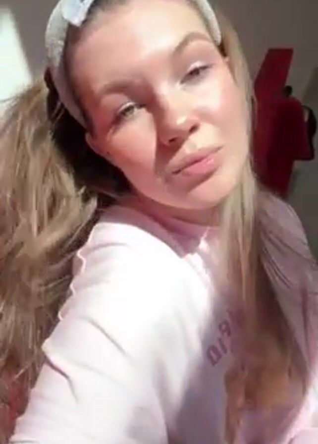 A young woman with long blonde hair styled in low pigtails and wearing a gray headband looks directly at the camera. She is wearing a light pink sweatshirt with a graphic on it. The woman has fair skin and is smiling subtly. Sunlight illuminates one side of her face. The background is blurred but includes a red object and a dark wall.