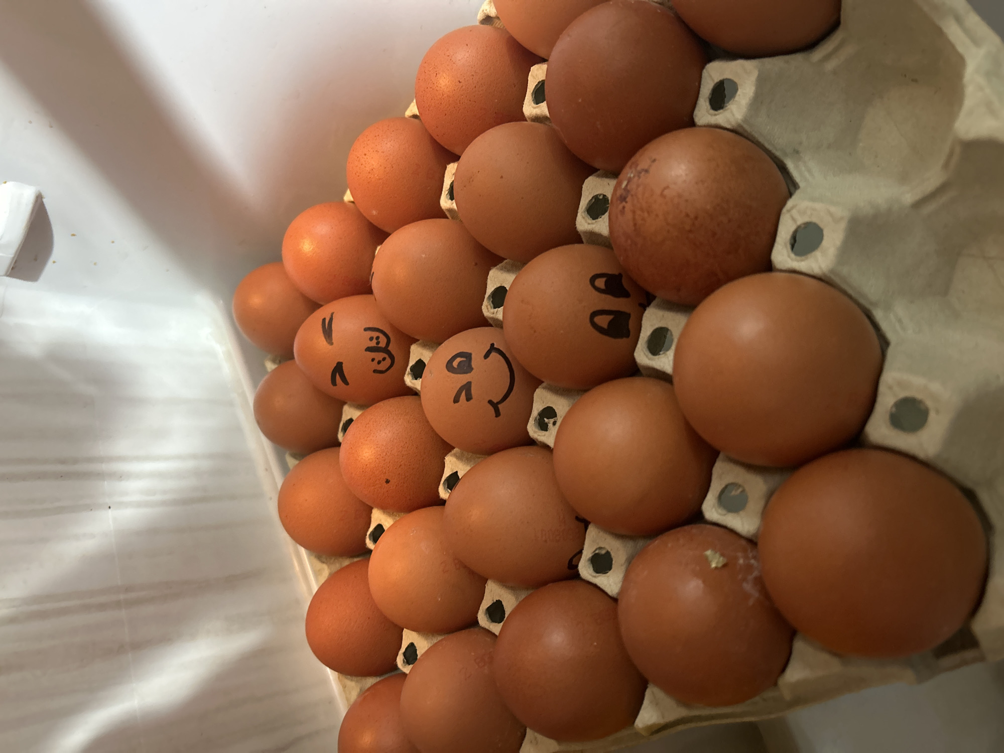 A partially filled egg carton sits inside a refrigerator. The carton holds approximately 30 brown eggs. Three eggs have faces drawn on them.