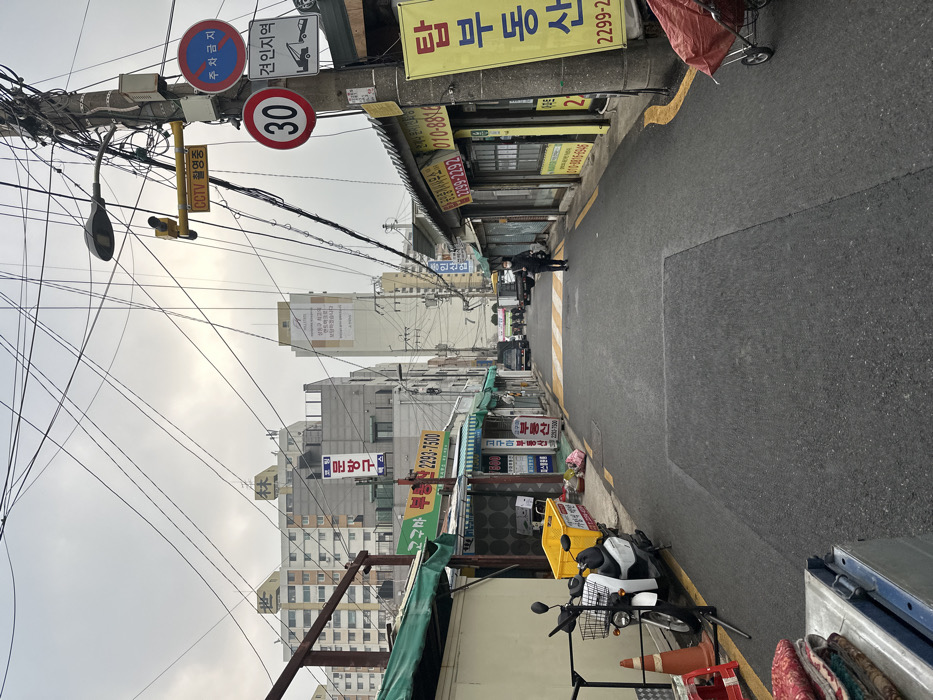 An urban alleyway with a mix of residential and commercial buildings. Power lines crisscross overhead, obscuring the sky. A "30" speed limit sign and "No Parking" sign are visible. Various shop signs display Korean text and phone numbers, including "2293-1500," "2299-2," and "7799-2292." One sign mentions "CCTV," and another refers to "real estate." A parked moped and a yellow trash can add to the scene's everyday atmosphere. People can be seen walking towards the other end of the alley.