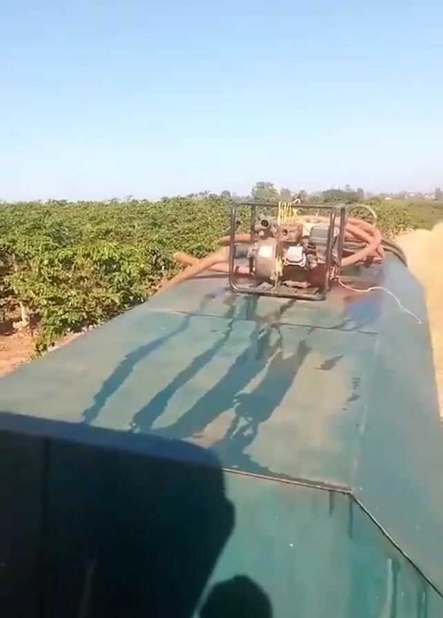large green, possibly metal, tank moving through what appears to be a coffee plantation on a clear, sunny day. A gasoline-powered water pump sits on top of the tank, with several hoses connected to it. The tank is moving next to rows of coffee plants, which are short, green, and planted in neat rows on red soil. Dry grass is visible in the field near the coffee plants. The camera appears to be mounted on the back of the tank, providing a view of the tank itself, the pump on top, and the surrounding plantation. A blurry shadow of a person holding the camera is visible at the bottom of the frame. The overall scene suggests agricultural work, likely irrigation or spraying of the coffee plants.