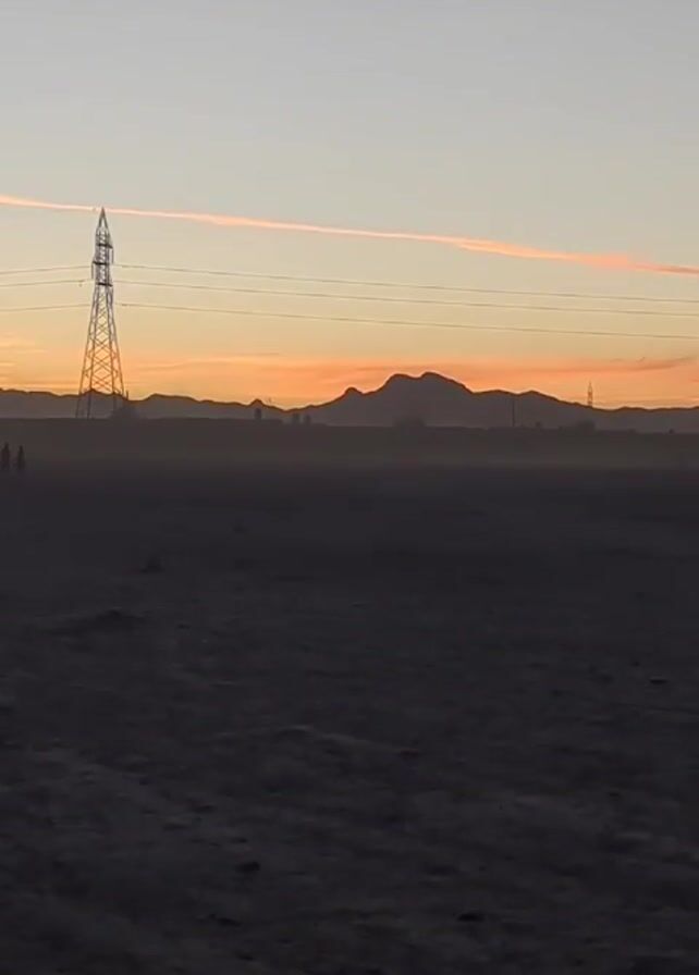 wide shot of a flat, dark-colored desert landscape at dusk or dawn. In the distance, there is a mountain range silhouetted against a colorful sky with shades of orange, yellow, and blue. A tall metal electricity pylon is visible on the left side of the frame with power lines stretching across the scene. There appear to be a few figures walking in the distance, but they are small and not clearly visible. A long, thin cloud or contrail is present horizontally across the sky, colored with the orange hue of the setting or rising sun. The ground appears dusty and uneven.