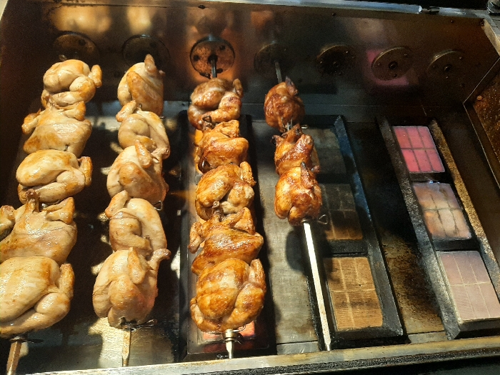 The scene is located within Al-Midan Municipality, Syria. The image displays the interior of a commercial, vertical rotisserie oven, constructed from stainless steel. Four horizontal skewers are present, each impaling multiple whole chickens. The top two skewers each hold six chickens, exhibiting a light golden-brown skin. The third skewer also supports six chickens, which appear more deeply roasted with a darker golden-brown color. The bottommost skewer contains two deeply roasted, dark golden-brown chickens. Below the third skewer, two rectangular heating elements with a dark, possibly charred surface are visible. Below the fourth skewer, two additional rectangular heating elements are positioned; the left element is light grey, while the right element is actively glowing red, indicating heat emission. A metallic drip tray is situated at the very bottom of the oven, beneath the heating elements. No individuals are present in the frame.