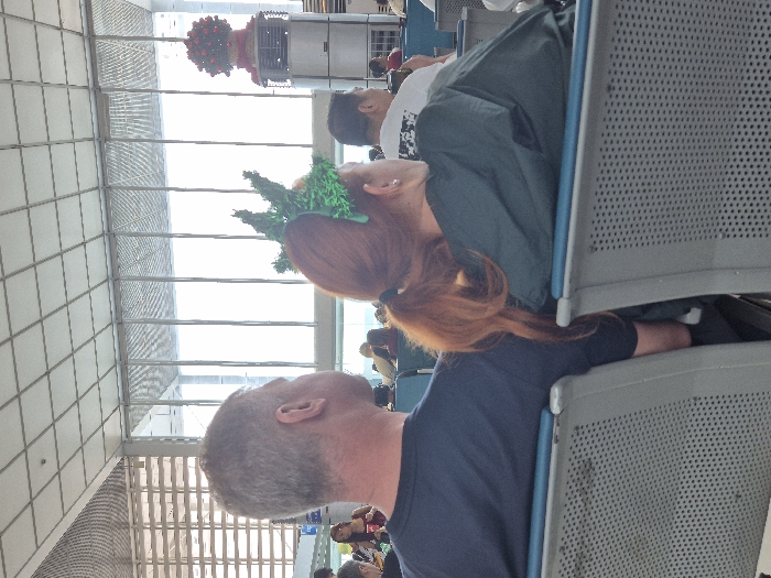 A group of people are seated indoors. A man with gray hair and a blue shirt faces left. Next to him, a person with red hair wears a green headpiece resembling the Statue of Liberty's crown. Another person in a white shirt and dark outerwear sits nearby. They are in a waiting area, possibly at an airport, with large windows and several rows of seating. Overhead, a decorative arrangement of red and green elements is visible.