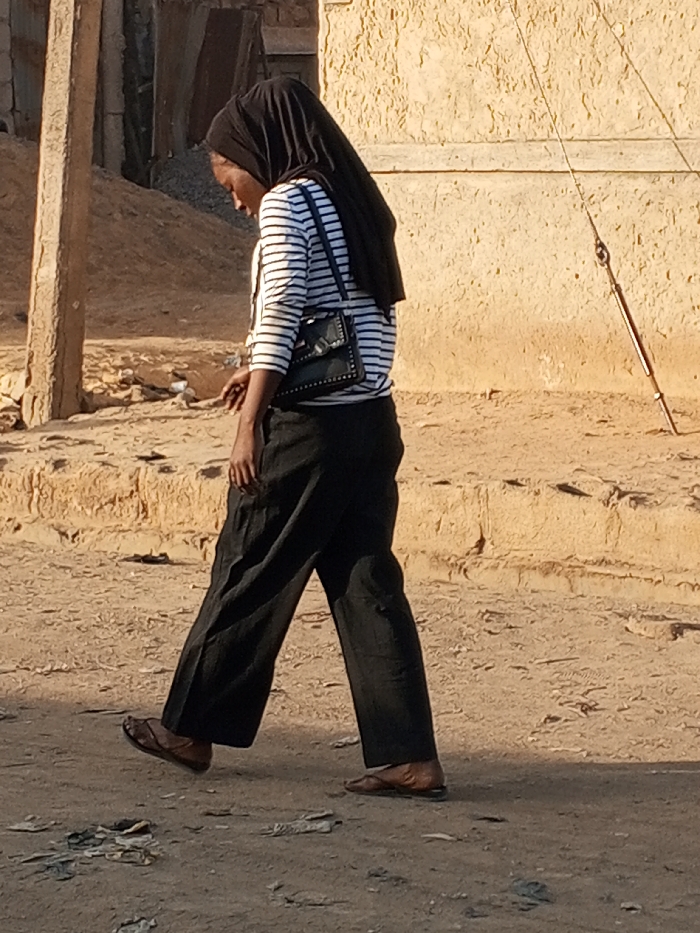 A person wearing a black hijab, striped shirt, and loose black pants walks on a dirt road