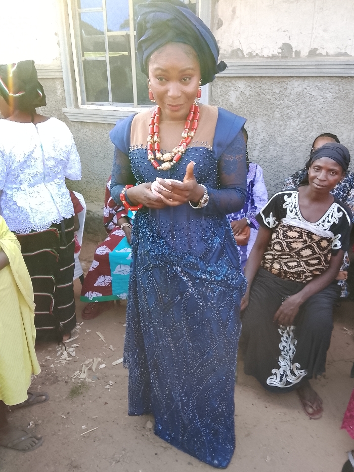 A woman in a navy blue gown adorned with beads and a matching head wrap stands prominently. She is accessorized with red coral jewelry, including a necklace and bracelet. Behind her, various people are partially visible, some seated. To her right, a woman in a patterned top and black skirt sits, looking at the camera. The background includes a building with a window and a sparse outdoor setting.