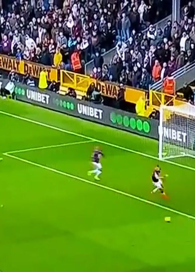 soccer game in progress. The field is green and surrounded by a crowd of spectators. A soccer ball is in play near the goal. There are several players on the field, some dressed in white and others in maroon and white. The goalkeeper, wearing a green shirt, is down on the ground attempting to block a shot. The goal is behind him with "UNIBET" displayed prominently on the net. Signage reading "DEWALT" and "UNIBET" lines the sidelines. One of the players in white kicks the ball towards the goal. The other players are running and positioned around the goal.