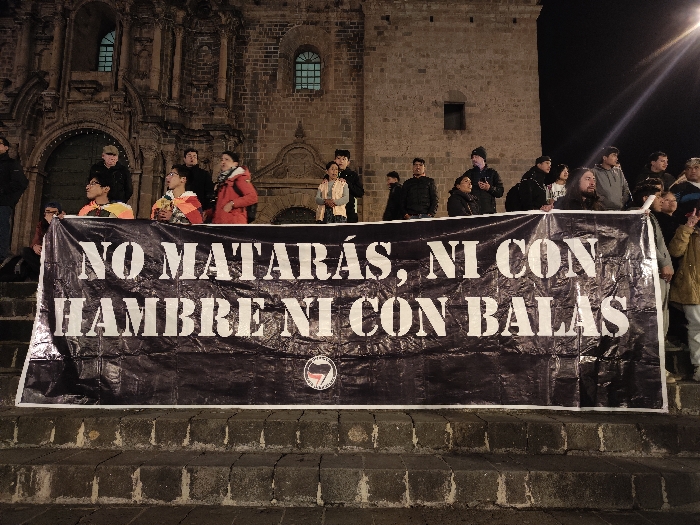 A nighttime scene depicts approximately 20-30 individuals gathered on irregular stone steps in front of the illuminated colonial stone facade of the Church of Santo Domingo (Coricancha) in Cusco, Wanchaq district, Peru. A large, dark-colored banner, held by multiple individuals, dominates the foreground. The banner displays white capitalized text that reads: "NO MATARÁS, NI CON HAMBRE NI CON BALAS" (You shall not kill, neither with hunger nor with bullets). A circular emblem, featuring a stylized 'A' within a circle, is positioned on the bottom right of the banner. The individuals, predominantly young to middle-aged adults, are dressed in casual evening attire, including jackets and hoodies. Two individuals on the left wear distinct multi-colored striped ponchos. The subjects are positioned behind the banner, with some appearing to look forward and others observing their surroundings. The background features the intricate stone architecture of the church, characterized by ornate detailing and multiple arched windows, illuminated by artificial light sources. The foreground consists of dark, uneven stone steps.