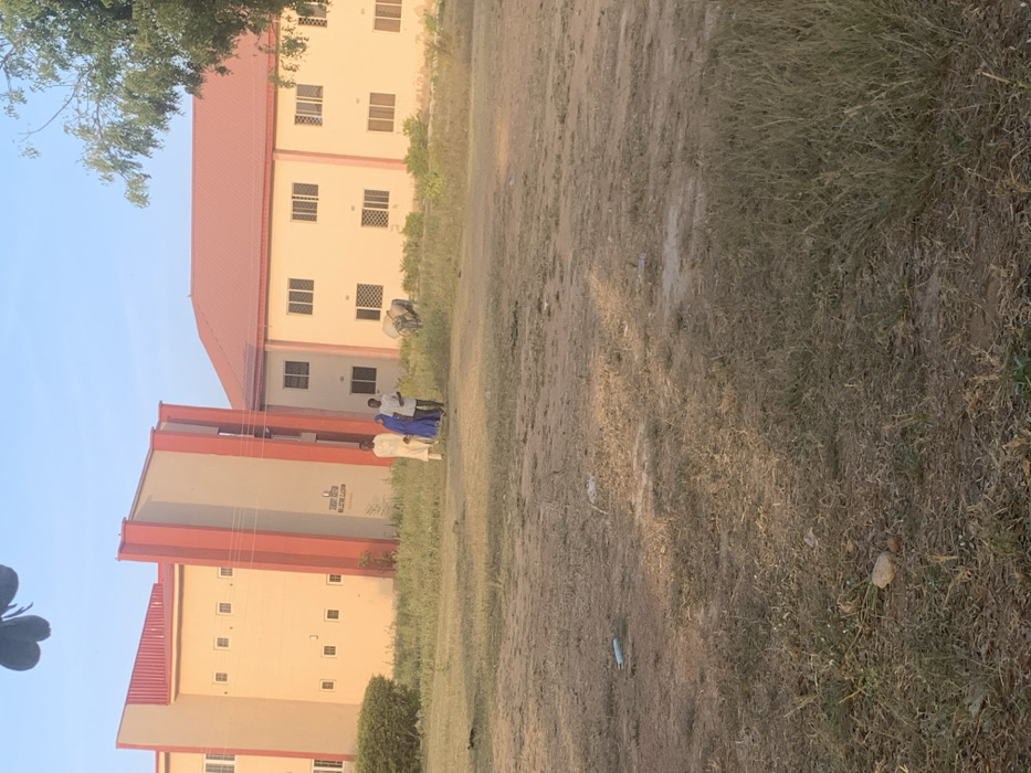 The image captures an outdoor scene in Dabawa, Nigeria, primarily featuring a large, dry expanse of ground with sparse, light-brown vegetation in the foreground and mid-ground