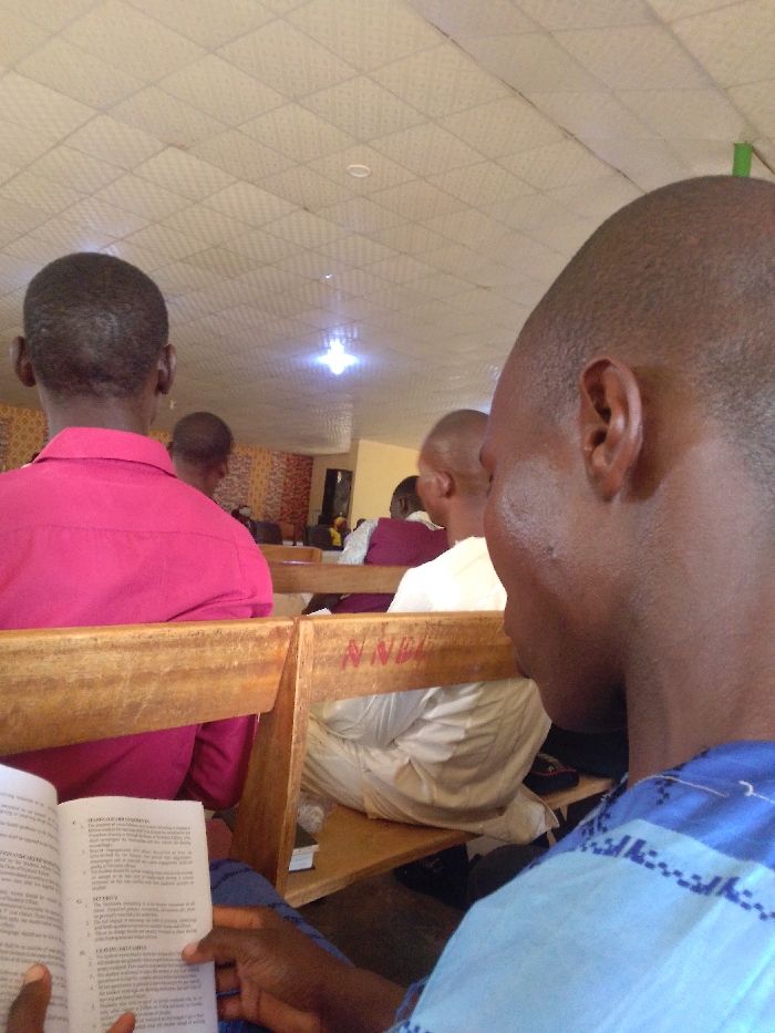 The image depicts an indoor gathering in Saminaka, Nigeria, featuring multiple individuals seated in rows of wooden benches