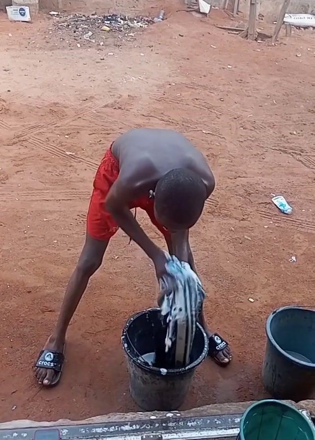 A shirtless young man is washing clothes in a black bucket in a dirt yard