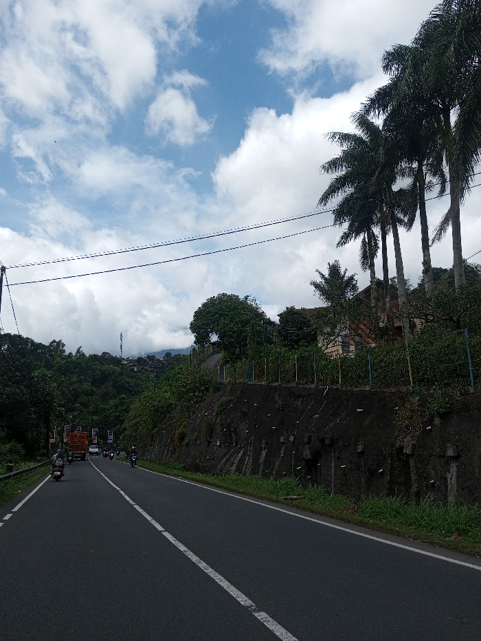 The image depicts a rural or semi-urban road scene in Gubbisamamidi, India, under a partly cloudy blue sky. A two-lane asphalt road, marked with a broken double white line in the center and a solid white line on the left shoulder, extends from the foreground into the distance, curving slightly left. On the left lane, vehicles are traveling away from the viewer: a person on a dark scooter in the foreground, followed by a light-colored truck and several motorcycles/scooters further back. On the right lane, multiple motorcycles/scooters are visible, heading towards the viewer in the mid-ground. To the left of the road, a steep, heavily vegetated hillside rises, with a cell tower visible on a distant peak. Some smaller structures are interspersed within the foliage. To the right of the road, a dark grey retaining wall or embankment, reinforced with visible white-capped bolts/nails, supports a lush green bank. Above this bank, a row of tall palm trees is prominent. Behind the trees and vegetation, a building with a reddish roof and light-colored walls is partially visible. A fence with yellow and green posts runs along the top of the embankment. Overhead, two black utility lines cross horizontally in the upper third of the frame. The overall environment suggests a hilly, green landscape.