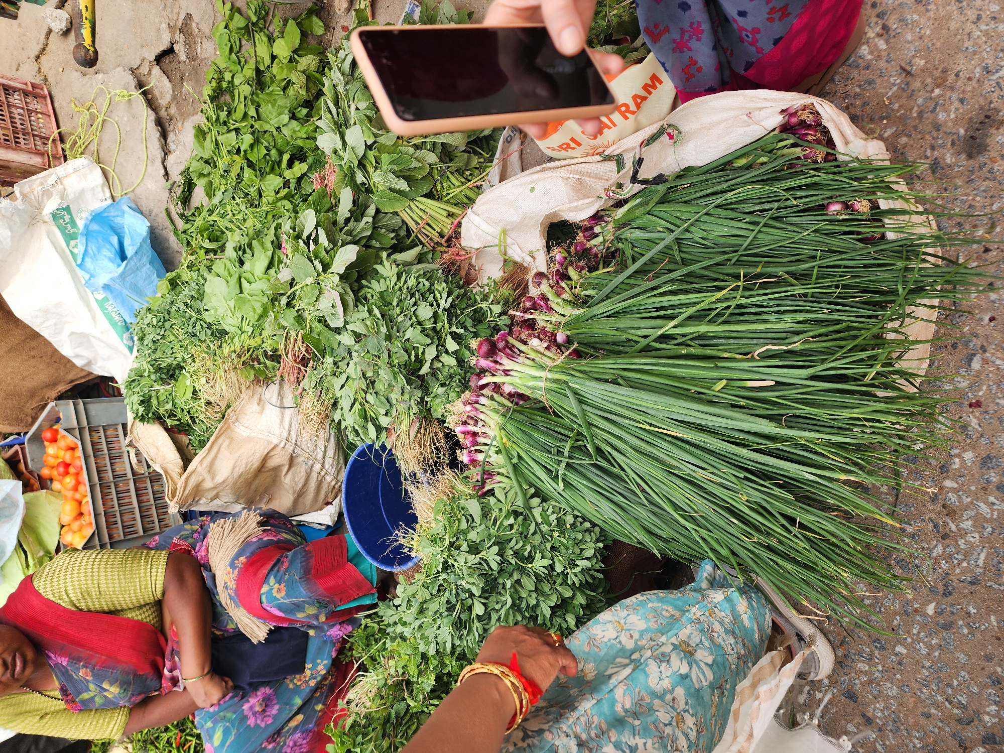This image depicts a vibrant, open-air street market stall in Puttaparthi, India, likely a vegetable vendor's setup on a concrete surface. In the upper left, a woman, presumably the vendor, sits on the ground, partially visible. She wears a colorful sari featuring red, green, and blue floral patterns. Her right forearm, adorned with a gold bangle, rests near a blue plastic bucket. Adjacent to her is a grey plastic crate overflowing with bright red and orange tomatoes. The foreground and central area of the image are dominated by an abundant display of fresh green vegetables spread directly on the ground and contained in various sacks. Prominently featured are large bundles of fresh spring onions with green stalks and purple bulbs. These are partially contained within a light-colored, possibly burlap, sack with red "SRI SAI RAM" text. Numerous bunches of other green leafy vegetables, including what appears to be fenugreek (methi) and spinach, are arranged around the spring onions and near the vendor. Bundles of herbs with reddish stems and white roots are also present. On the left, a customer's hand, wearing multiple gold bangles and a red string, is visible against a light blue floral patterned garment, possibly selecting produce. On the right side, another person's hand holds a rose-gold colored smartphone with a dark screen, angled towards the scene. Other objects scattered on the ground include a white plastic bag with green lettering, a length of yellow string, and a rustic wooden stick with a metal end in the upper right background. The concrete ground is uneven and appears well-worn, typical of an active market environment.