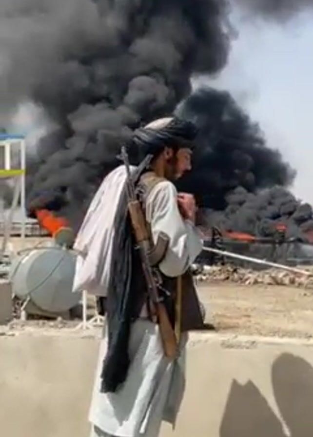 A man with a rifle slung over his shoulder is standing on a ledge, looking at a large fire. The fire is generating a lot of thick, black smoke. The man is wearing traditional clothing, including a turban. He turns, briefly speaks to someone out of frame, and turns back to the fire. There are buildings visible in the background. The scene appears to be in a desert or arid environment.