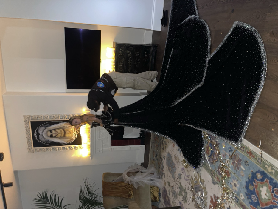 An interior scene in London, United Kingdom, depicts two individuals. A woman with light hair and visible arm tattoos stands centrally, facing slightly right, adorned in an elaborate black gown featuring a fitted, off-the-shoulder bodice and an expansive, multi-lobed train. The gown is extensively embellished with small, reflective silver beads and trimmed with a silver edge, spreading across a patterned rug and dark wooden floor. A second individual, wearing a dark hooded sweatshirt and light-colored cargo pants, is bent over, actively adjusting the rear of the woman's gown. The environment includes a white fireplace mantelpiece in the background, laden with numerous lit candles. Above the mantelpiece, a large portrait in an ornate silver frame depicts a woman with long blonde hair. To the left, a light-colored armchair with a draped fabric and a partially visible potted plant are present. To the right of the fireplace, a dark wooden chest of drawers also displays several lit candles, with a large, dark flat-screen television mounted on the white wall above it. Metallic gold tinsel is scattered on the patterned rug in the foreground. The primary illumination originates from the candles, creating a warm ambient light.