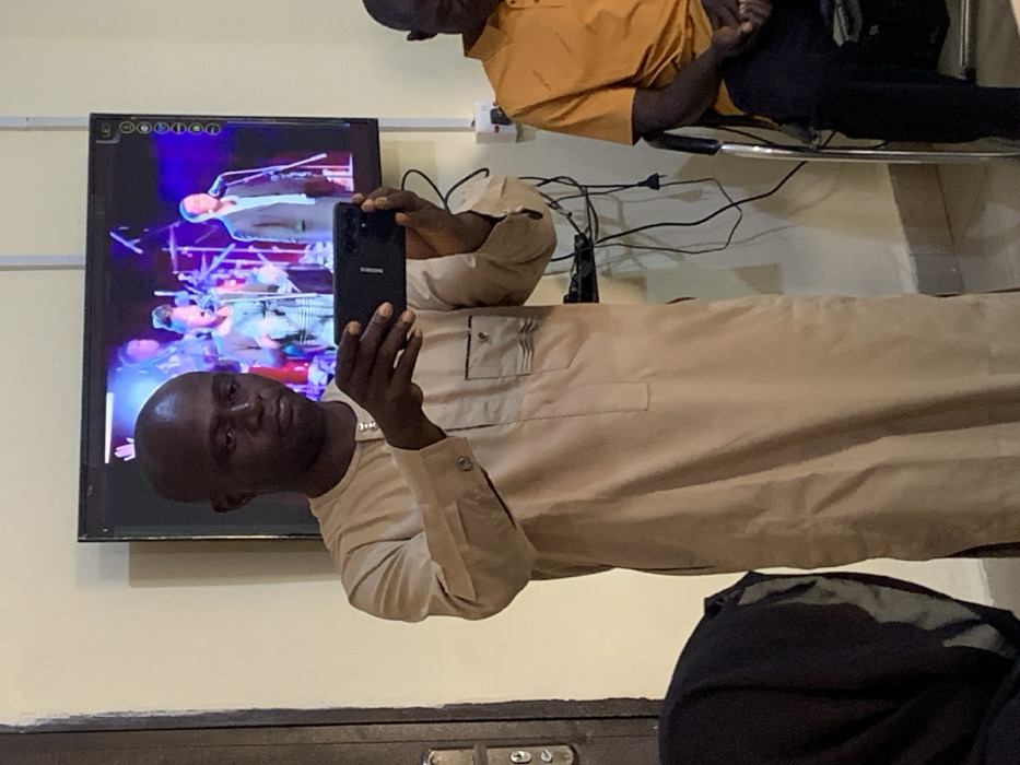 A male subject with a dark complexion and a bald head stands prominently in an indoor setting identified as being within the city of Akwanga, Nigeria
