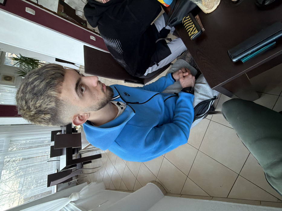 The image depicts an indoor scene within a building. The specific location in Zheleznitsa, Bulgaria, is not discernible from the visual information provided. A young male is centrally positioned, seated at a dark brown rectangular table. He has short, blonde-streaked hair with a high fade, a light beard, and dark eyebrows. He is wearing a bright blue Nike zippered hoodie over a white t-shirt with black patterns, and light grey sweatpants. A dark-colored watch is visible on his left wrist, and a tattoo is present on his left leg below the hem of his sweatpants. His hands are clasped in front of him, and he is looking towards the right side of the frame with a neutral expression. To his right, a second individual is partially visible, also seated at the same table. This person is wearing a black hoodie with a white graphic design on the upper back and grey and black color-block sweatpants. On the table, near the second individual, a small rectangular case with a black and yellow tiger-stripe pattern is visible, along with a piece of bread or pastry and a clear glass. A black bag is also partially visible on the table. The room features a light-colored tiled floor with diagonal patterns. The walls are white. In the background, large windows are present, covered by sheer white curtains, allowing natural light into the space. Beyond the windows, bare tree branches are visible, suggesting an outdoor environment in a colder season. Further in the background, another dining area is visible with a large dark wooden table and multiple dark chairs. A houseplant in a pot is also visible near the windows. The perspective of the photograph suggests a third individual is seated opposite the primary subject, with their green-colored pants visible in the lower left foreground.
