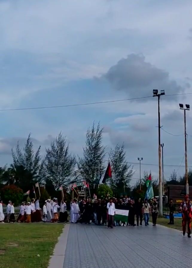 procession of people walking along a paved path. They are carrying flags, with the Palestinian flag being prominent. Some of the people are dressed in traditional Muslim attire, including white robes and head coverings. The procession is taking place outdoors, with trees and grass visible in the background. The sky is partially cloudy.