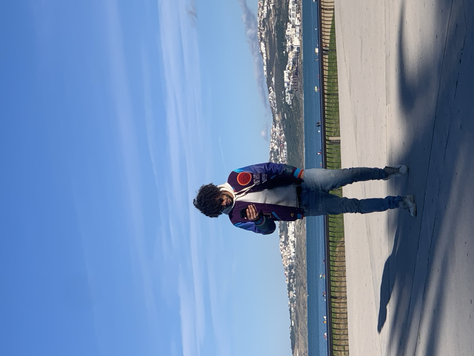 A man stands on a walkway, facing sideways, looking at his phone. He wears jeans, white shoes, and a colorful jacket over a grey hoodie. His curly hair is prominent. Behind him is a blue sky with light clouds. In the distance, across a body of water, is a hillside covered in buildings. His shadow stretches long beside him on the walkway. A metal railing separates the walkway from the view of the water and the town beyond.