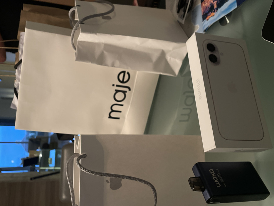 The image displays an assortment of items on a reflective surface. There are several white shopping bags, one with the black 'maje' logo prominently displayed. A white iPhone box sits beside the bags. A small, dark blue device labeled 'waka' is also visible. The overall composition suggests a recent purchase or shopping haul. The background shows a blurry window with some visible city lights.