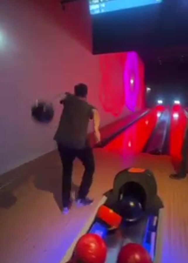 A person bowls with a left-handed approach in a bowling alley with pink and red lighting. There are at least two people. The lane is red, and a screen displays a pink and purple design. A ball return system is in the foreground holding bowling balls. The first person celebrates after bowling.