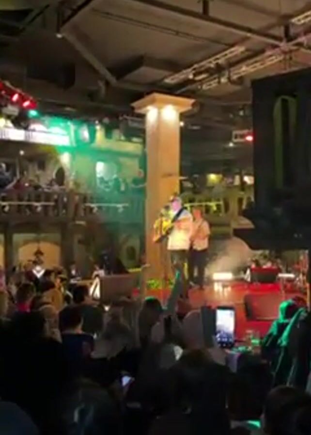 A crowded indoor venue is the scene for a live musical performance. The camera is positioned in the audience. A male musician on stage sings and plays an acoustic guitar, flanked by another person in a jacket who may also be a musician. The audience is packed in front of the stage, many holding up their phones to record. A tall, column-like structure stands on the stage. The interior design of the venue includes a balcony level where more people are standing and observing the performance. The venue has a distinctive, themed design with faux-stone and decorative lighting. There are other decorative structures in the background, including what looks like a castle facade on the upper levels. The overall lighting in the venue is colorful and dynamic.