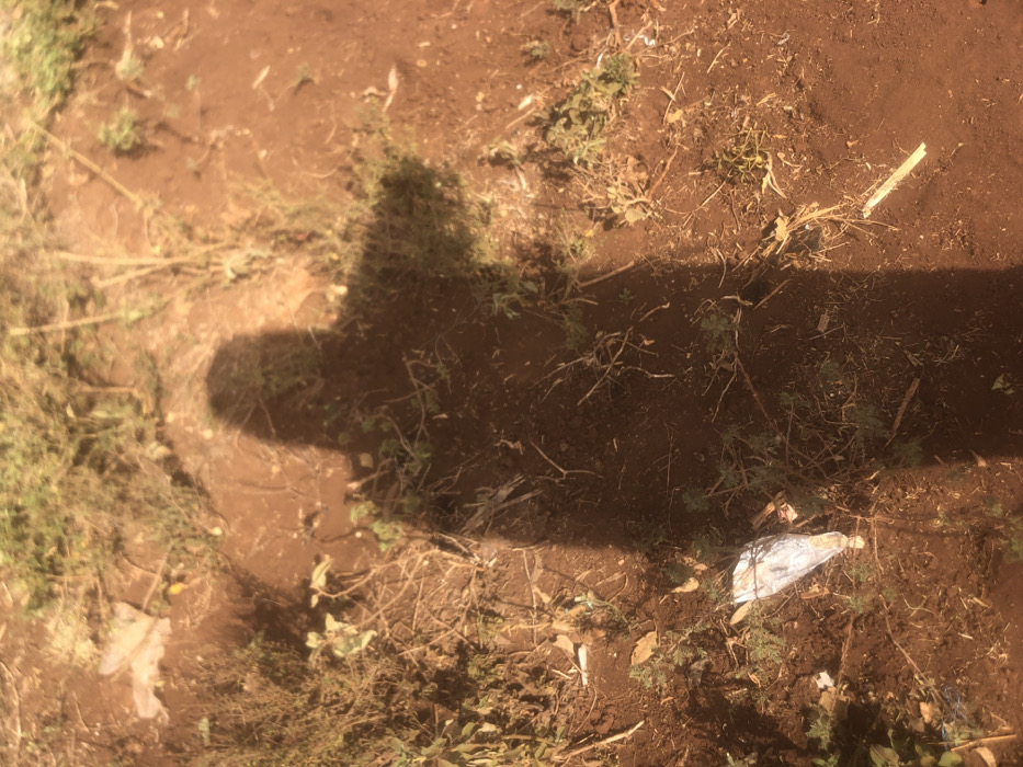 The scene depicts an outdoor environment in Ngong ward, Kenya. The image captures a high-angle view of reddish-brown earth, illuminated by strong sunlight. A prominent, vertically oriented human shadow is cast centrally, with its head portion positioned towards the upper frame, indicating an individual standing and casting the shadow. The ground consists of soil interspersed with sparse, dry vegetation, including small green plants and dried grass. Specific debris items include a crumpled light-colored plastic bag or similar refuse in the lower-left quadrant, another piece of light-colored material in the upper-left, and a small, thin, light-colored stick or fragment located in the lower-right area. No other individuals or specific actions are directly observable beyond the shadow's presence.
