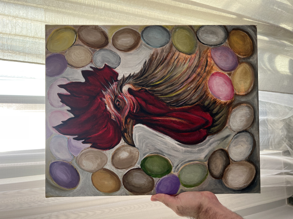 An oil painting on canvas, depicting the head and upper body of a rooster in profile, facing left, is presented within an indoor setting in Rafailovići, Montenegro