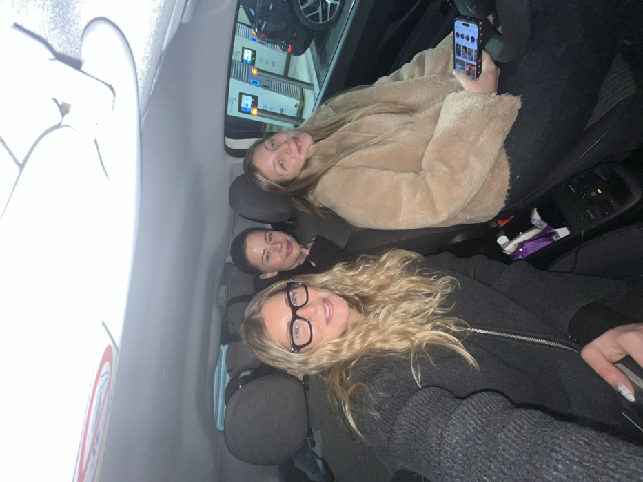 Three women are visible inside a car, likely in the back seat. One wears large glasses and a dark sweater, another a tan fuzzy jacket, and the third a dark top. The woman in the jacket holds a smartphone. Through the car window, charging stations are visible with illuminated screens. The interior of the vehicle is primarily dark.