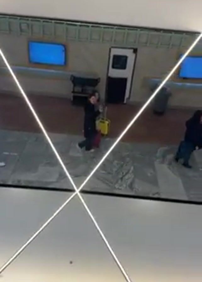 From a low angle looking upwards, the video shows a ceiling with crossing white neon lights that reflect a scene below. The reflection shows a hallway with a marble-like floor and a wall with two televisions displaying moving images. Several people are seen walking in different directions, some pulling luggage. A service cart, a trash can, and a closed door are also visible along the wall. A dining area with tables and people is partially visible at the far right of the reflection. Two people are walking together, one pulling a yellow suitcase and waving, as they approach the foreground of the reflected scene.