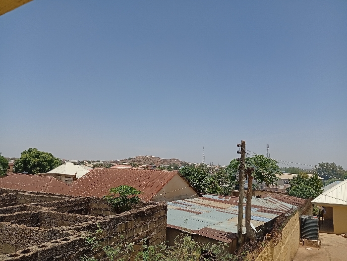This image captures an elevated daytime view of a densely built-up area in Jos, Nigeria. The upper half of the frame is dominated by a clear, light blue sky. In the foreground, an unfinished or partially demolished structure composed of coarse concrete blocks forms an open rectangular enclosure, with vegetation growing within its walls. Beyond this structure, a landscape of residential buildings unfolds, predominantly featuring corrugated metal roofs in various states of repair, exhibiting hues of rusty brown, faded grey, and occasional brighter silver or white. Mature green trees and dense foliage are interspersed throughout the rooftops. To the right of the midground, a dark wooden utility pole with multiple cross-arms and insulators stands upright, from which power lines extend horizontally. Adjacent to the pole, a light-colored, possibly yellow, concrete wall topped with strands of barbed wire delineates a property boundary, extending towards the right edge of the frame. A black cylindrical water storage tank is visible on the ground next to this wall. In the distant background, a prominent hill or elevated landmass is visible, densely covered with numerous structures, suggesting a built-up incline. Several communication or radio towers with lattice structures are discernable on the distant horizon, particularly towards the right side of the frame. No individuals are visible in the scene, and no specific actions or interactions are depicted. The overall environment appears dry and sunny.