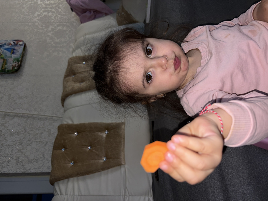 This indoor scene in General Toshevo, Bulgaria, presents a young female child, approximately toddler age, seated on a dark grey surface. The child has dark brown hair and eyes, and is wearing a light pink long-sleeved shirt with visible dark stains on the front. A small silver-colored earring is present in her left earlobe, and a red and white braided bracelet adorns her left wrist. Her left hand is extended towards the viewer, holding a single, circular orange slice, consistent with a cut carrot. The child's facial expression displays a slight pout or frown, with her gaze directed at the camera. In the background, a light-colored, tufted sofa with six visible rhinestone-like buttons on its backrest is positioned behind the child. Behind the sofa, a light-colored wall features a patterned wallpaper. A small, multicolored bag or fabric item hangs on the wall in the upper right portion of the frame.