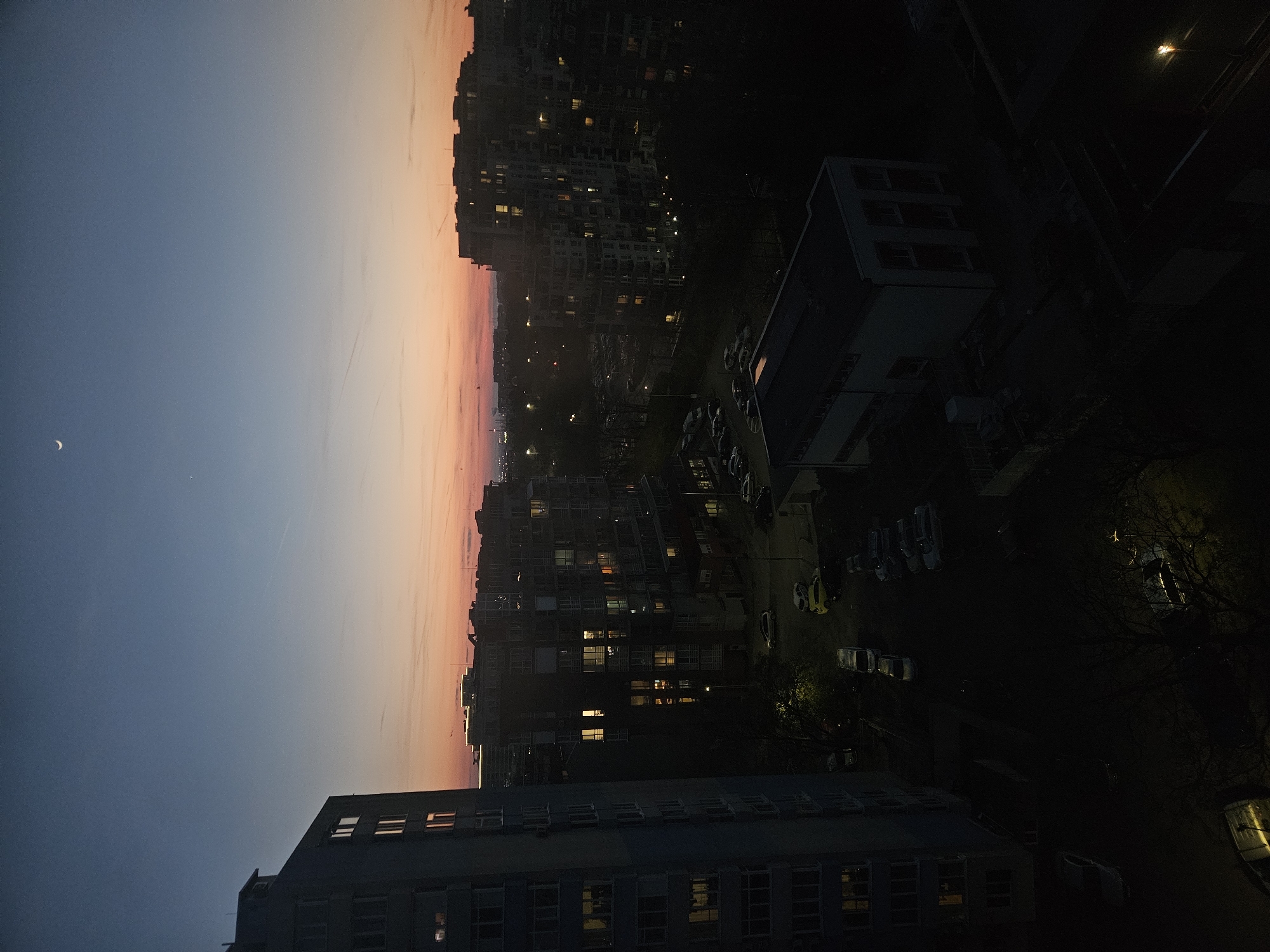 nighttime view of Burgas, Bulgaria, oriented vertically. In the sky, a crescent moon is visible against a twilight gradient ranging from blue to orange near the horizon. Numerous high-rise buildings are arranged along a horizontal line, their windows illuminated. Adjacent to these are other buildings, appearing darker, next to a street with parked cars. Trees are also visible at the right.