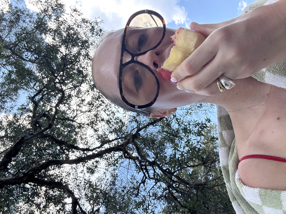 From a low angle, a person with glasses eats a peach outside on a sunny day. The background includes trees and a blue, partly cloudy sky. The person's right hand holds the bitten peach. The person wears rings on their fingers, and a light green and white striped towel around their neck. A red strap is visible.