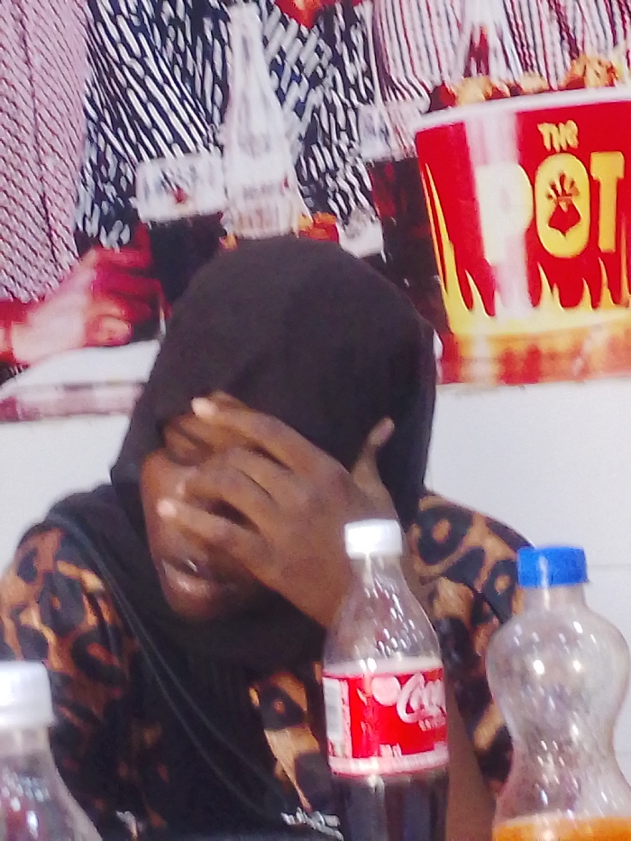 The image captures an indoor scene within Giginyu, Nigeria, focusing on an individual seated at a table. The person, with dark skin, wears a dark head covering and a brown and black leopard-print top. Their right hand is raised, covering their lower face, with fingers splayed, and their head is slightly bowed. On the table in the foreground are three plastic bottles: a clear bottle with a white cap on the left, a Coca-Cola bottle with a red label in the center, and a clear bottle with a blue cap containing an orange liquid on the right. The background is dominated by a large promotional banner or poster featuring stylized imagery including striped patterns, beverage bottles and glasses, and a prominent red bucket labeled "THE POT" in yellow, with yellow flame graphics, containing what appears to be fried food.