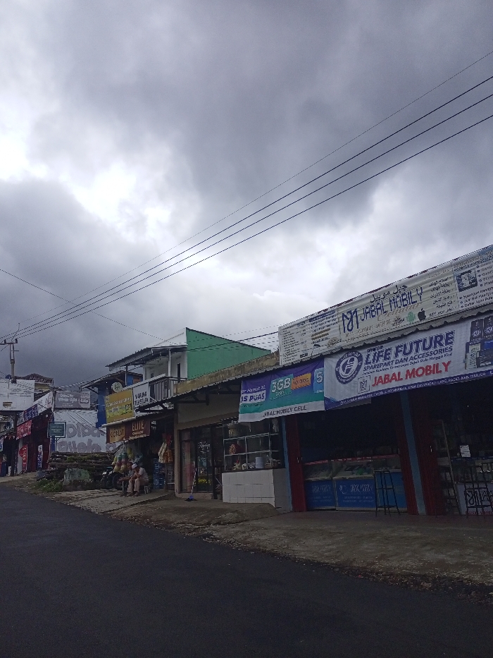 A street view under a cloudy sky features a row of small businesses. Banners adorn the storefronts, prominently advertising "JABAL MOBILY" and "LIFE FUTURE" with phone and tech accessories. One sign highlights "3GB" data plans. People gather near a shop. The road is dark asphalt, and utility lines stretch across the sky.