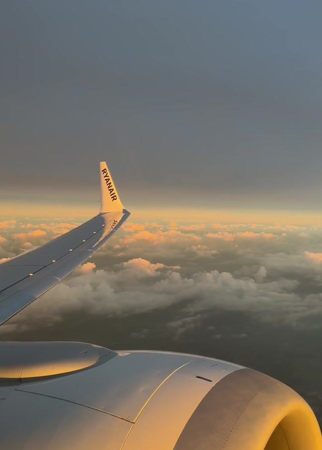 n aerial view from a Ryanair airplane. The wing of the plane, with the Ryanair logo visible, is in the frame, along with the engine. Below the plane, there is a sea of clouds with a golden horizon. The sky above is gray.