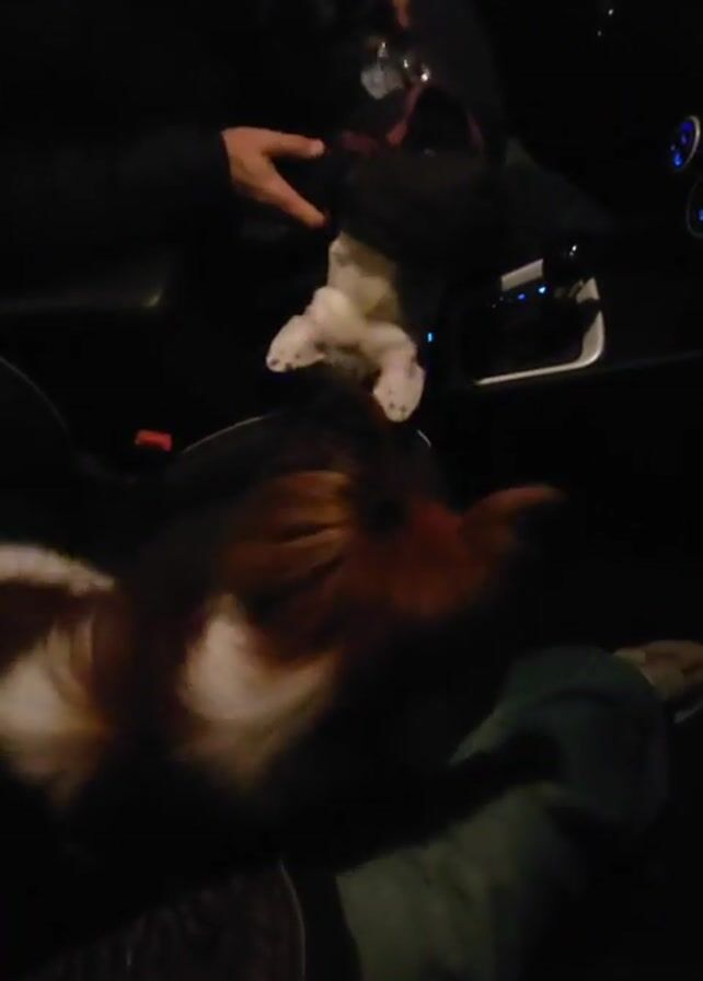 In a dimly lit setting resembling the interior of a vehicle, a small dog with white and brown fur is visible on a person's lap, partially obscured by their leg clad in green pants. Another person, wearing a dark jacket, reaches out with their hand towards the dog. A white cloth is crumpled near the vehicle's center console, which features several blue illuminated buttons. The overall image quality is grainy.