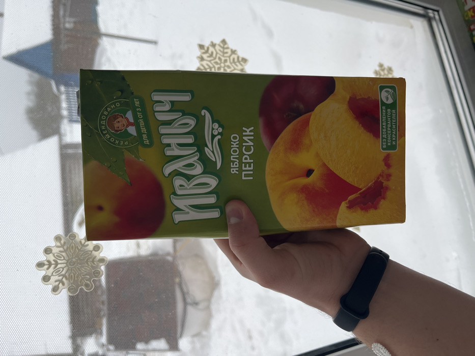 The image displays a juice box for children. The brand is "Ivanych" (Иваныч), and the flavor is apple-peach (ЯБЛОКО ПЕРСИК). The packaging indicates that it's recommended for children from 3 years old (ДЛЯ ДЕТЕЙ ОТ 3 ЛЕТ). It also states that it has no added preservatives and dyes (БЕЗ ДОБАВЛЕНИЯ КОНСЕРВАНТОВ И КРАСИТЕЛЕЙ). A hand holding the juice box can be seen, with a smartwatch on the wrist. The background shows a window with snowflake decorations and a view of snowy outdoor scenery.