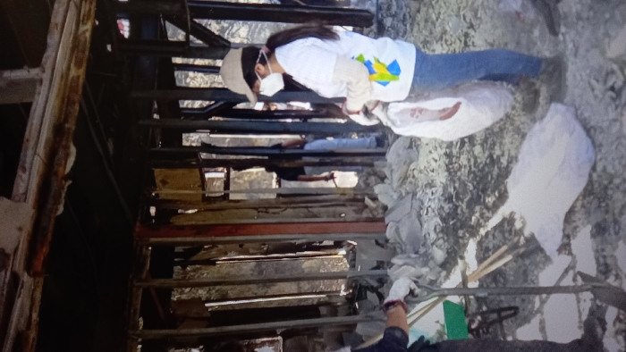 The image depicts an indoor scene within a severely fire-damaged structure in Concepcion, Chile. The environment shows extensive charring on wooden and metal support beams and what remains of the ceiling. The floor is covered with a substantial layer of white and grey debris, consistent with ash, insulation, and shattered building materials. Three individuals are visible, engaged in cleanup or demolition activities. In the foreground on the right, a female individual is seen in profile, facing left. She wears a light-colored baseball cap, a white face mask, a white long-sleeved t-shirt with a blue and yellow graphic design on the right chest, blue jeans, and dark shoes. She wears white protective gloves and holds a clear plastic bag containing white debris. To the mid-ground left, partially obscured, another individual's lower torso and hands are visible. They wear dark clothing and white gloves and are holding the handle of a shovel, which is partially embedded in the debris. A green wheelbarrow is visible behind this individual. In the background, a third individual, presumed male, is seen deeper within the damaged framework. This person wears a dark t-shirt and light-colored pants and appears to be interacting with the debris, holding a tool such as a crowbar or another shovel. The scene indicates a post-disaster cleanup operation.
