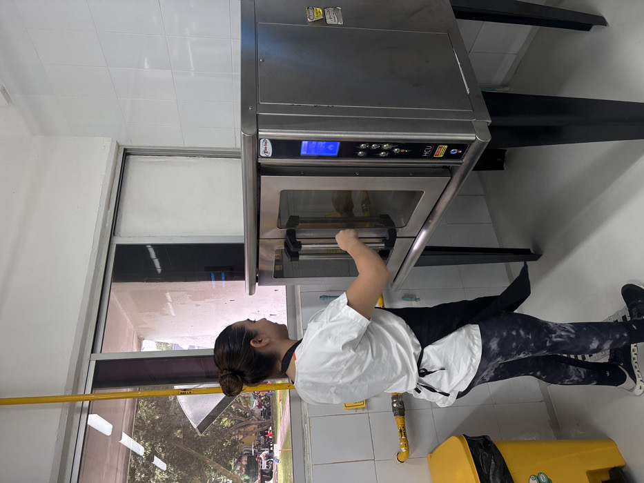 An indoor scene in a professional kitchen or food preparation area in Chablekal, Mexico, shows a female subject interacting with a commercial oven