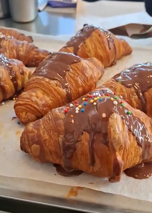 - "tray of freshly baked croissants being decorated with chocolate and sprinkles" by FM-B2gbf2, licensed under CC BY 4.0
