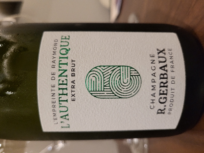 A champagne bottle with a white label featuring green text and an abstract design. The label reads "L'EMPREINTE DE RAYMOND L'AUTHENTIQUE EXTRA BRUT" on the left side. A modern green design sits in the center. The right side says "CHAMPAGNE R. GERBAUX PRODUIT DE FRANCE." The bottle appears slightly chilled with condensation.