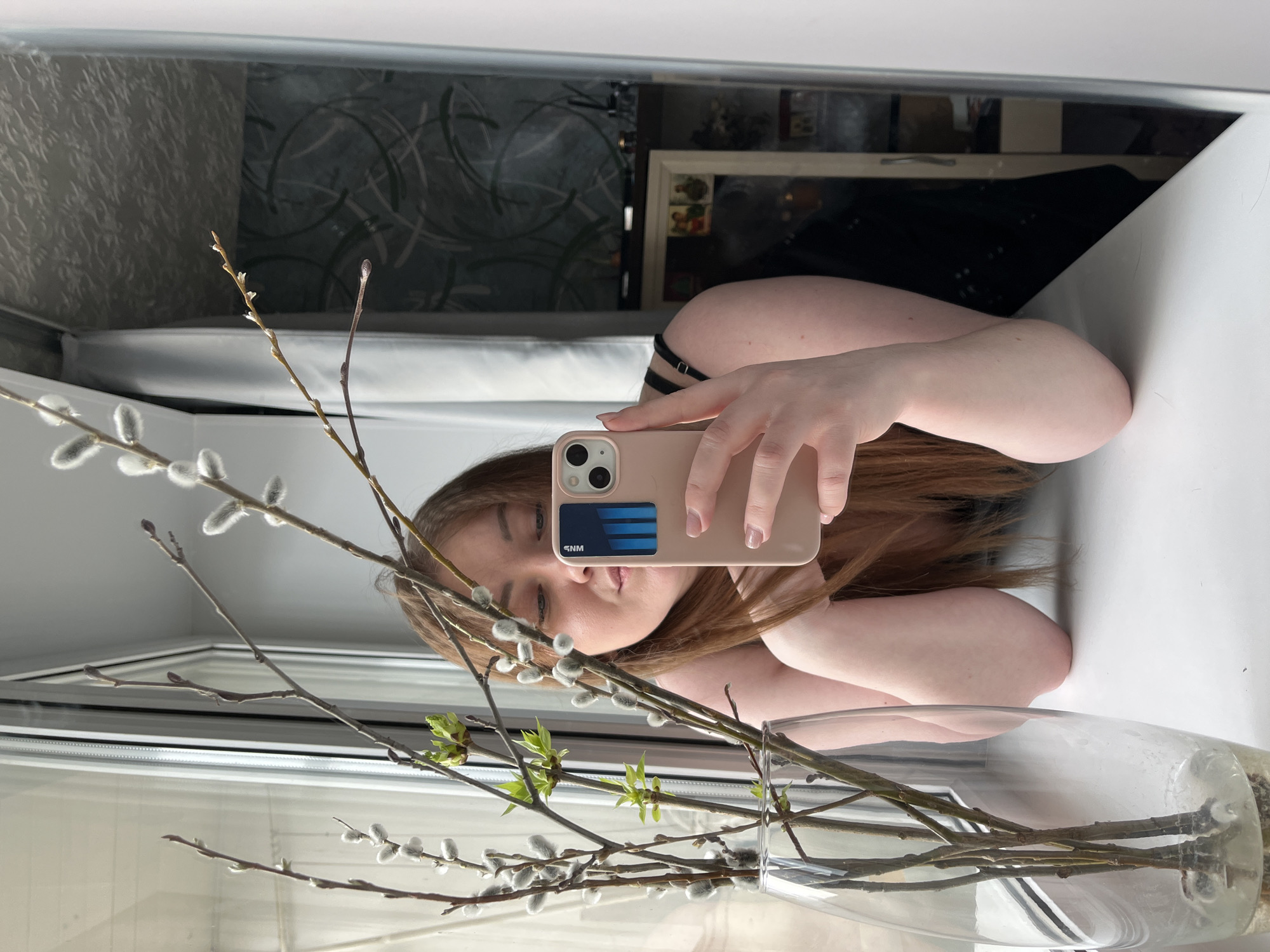 A woman is taking a selfie in front of a mirror. She is holding a pink iPhone with a card holder attached to the back. A vase with willow branches sits in front of her on a white surface, likely a windowsill. The reflection in the mirror shows a room with furniture and decorations. While the prompt specifies the city of Chaikovsky, Russia, this cannot be confirmed from the visual elements within the image.