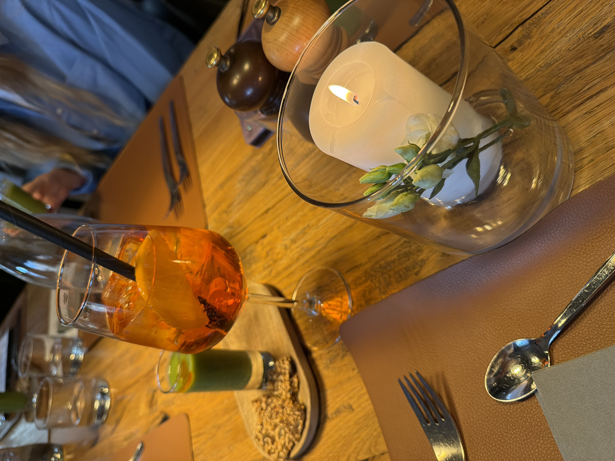 The image depicts a table setting in Ljubljana, Slovenia. On a wooden table are place settings with brown placemats, silverware (a fork and a spoon), and gray napkins. A lit white candle in a glass vase with white flowers is present. An Aperol spritz with a black straw is in the foreground, accompanied by a small glass of green liquid and a wooden spoon with brown crumbs. Wooden salt and pepper shakers are also on the table. A person is partially visible in the upper left of the image.