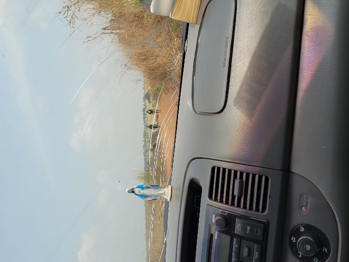 The image depicts a scene viewed from within a vehicle, looking forward through a windshield displaying multiple scratches and glare